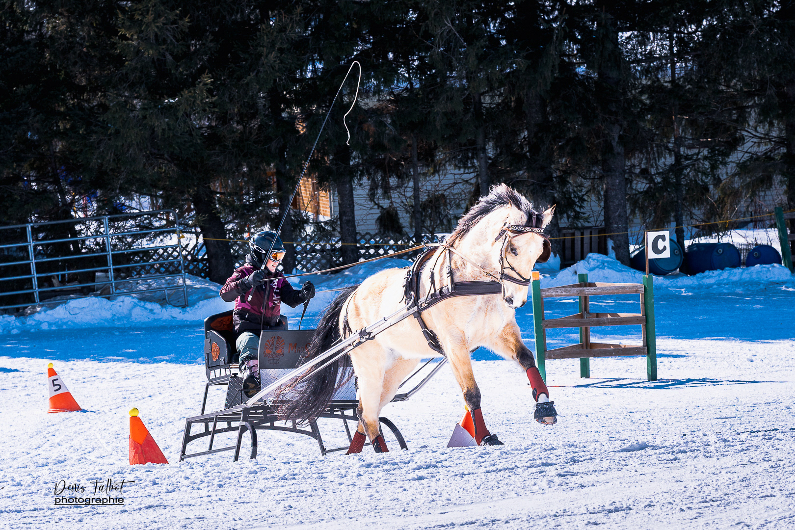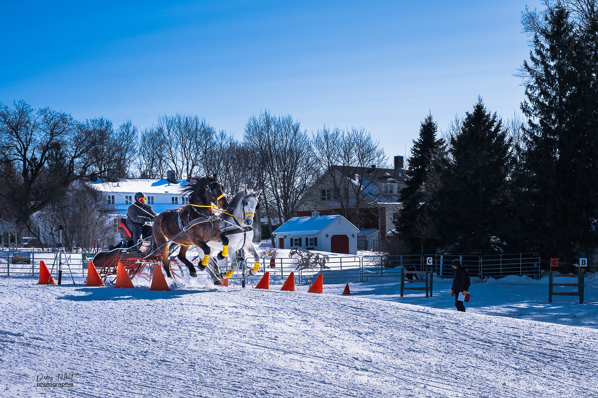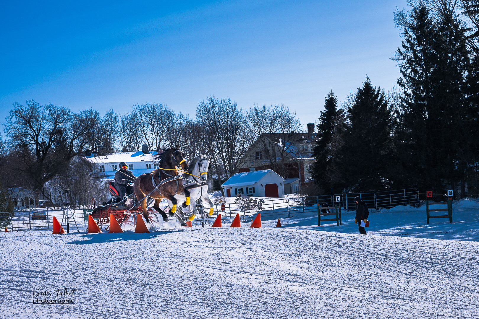 Discipline où un meneur doit faire courir un équipage de chevaux sur un parcours d'obstacles prédéterminés dans le meilleur temps possible. Elle est composée de deux rondes de qualifications et d'un barrage (Source: www.ladaq.com)